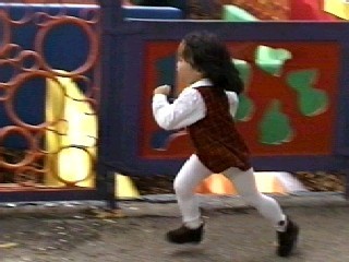 | これは現在の香織。 San Francisco Zooで買った、ライオンの赤ちゃんのTシャツを着ていたので、ビデオに撮ったのだが、気分よくベッドでボヨンボヨンとトランポリン遊びをしていたのを止められてフテクサレてしまった。 |