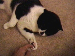 ペット用品屋さん(PETCOといってそこらじゅうにある)で、ネコタワーを買ってあげた。 マチエはすっかりお気に入りで、毎日そこでお昼寝をしている。 Los Gatosで買ってきたアメリカンな猫じゃらし(^-^;)でちょっかいを出してみた。 |